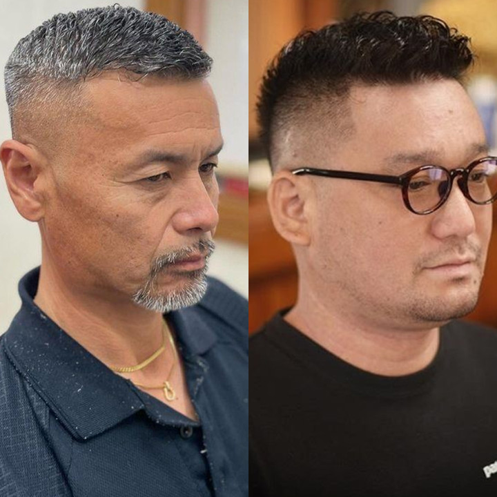 如果是没有明显脱发、秃头的情况,发量较多的话,则可以尝试三七分中短发。两侧不用直接推,用剪刀适当去薄来增加服帖感。