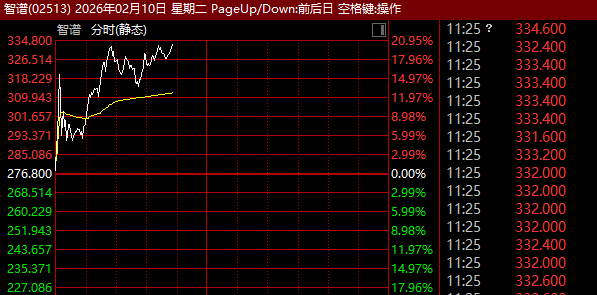 2月10日,延续昨日强势,港股市场AI概念股今日再度集体走强,其中,“全球大模型第一股”智谱(02513)在昨日收涨36%后,今日盘中再度飙升超20%,报333港元,股价再创上市新高,市值逼近1500亿港元。